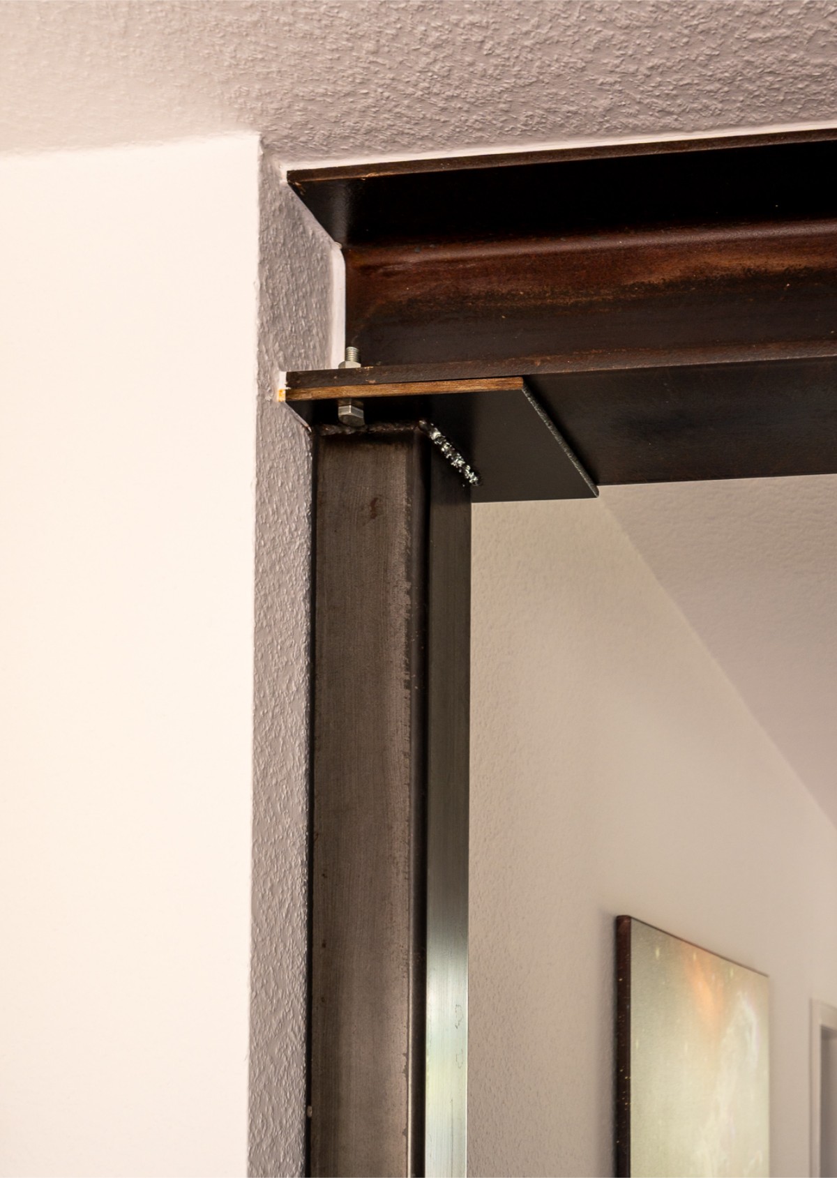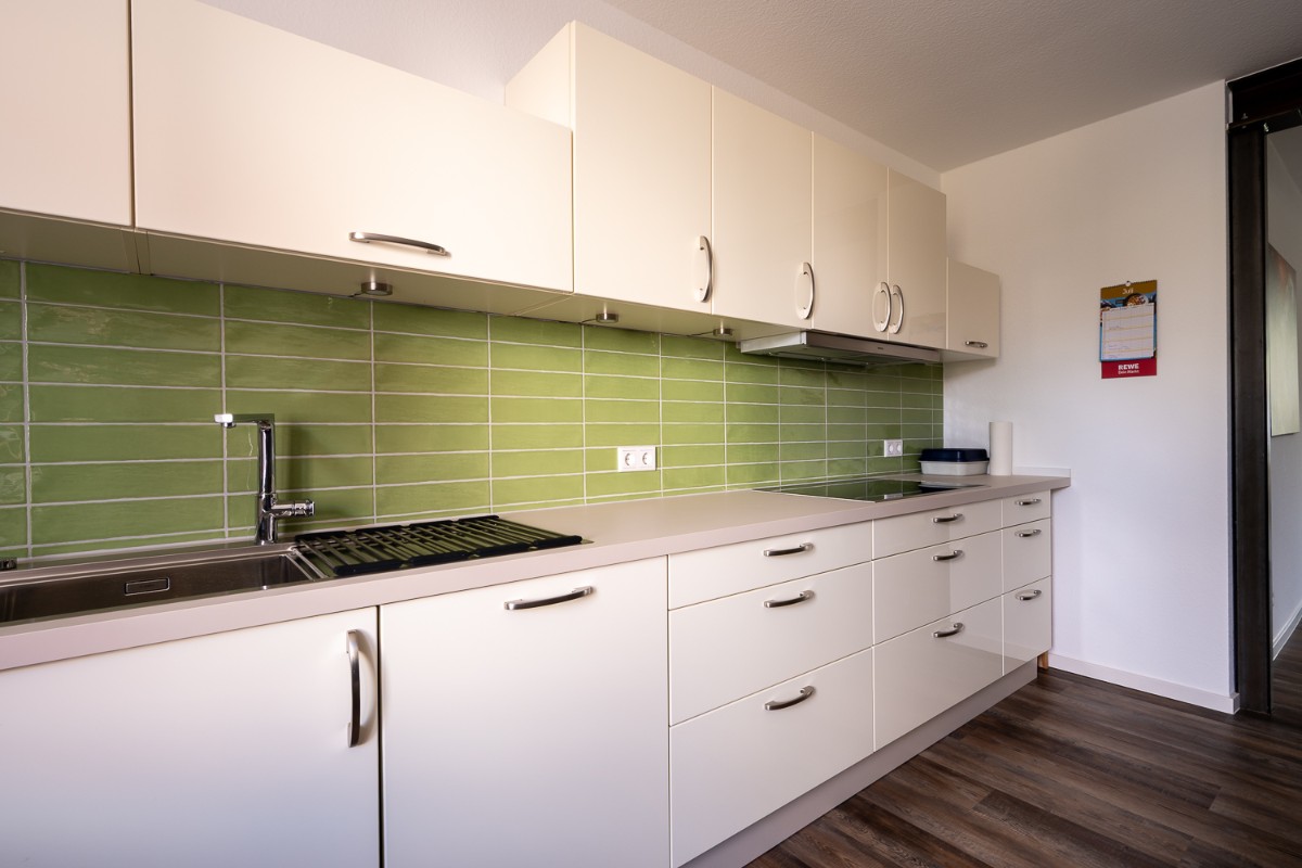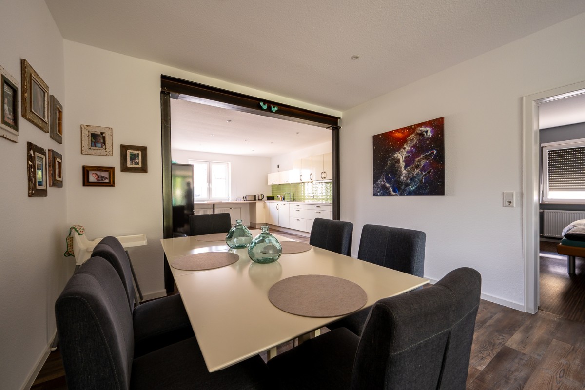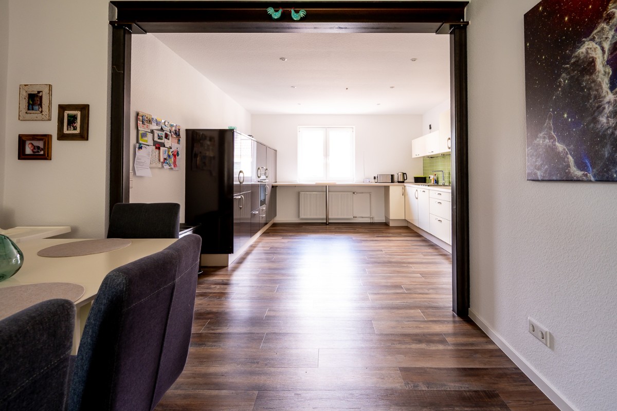 Bei dieser Komplettsanierung einer Wohnung im Raum Großenlüder wurde der Umzug unserer Kundin vom Dachgeschoss ins Erdgeschoss realisiert. Um im Erdgeschoss mehr Platz zu schaffen, wurde der Bereich für Küche und Essen durch den Abbruch einer tragenden Wand deutlich vergrößert. Die entstandene Öffnung wurde mit einem Stahlträger und Stahlstützen abgefangen, die lediglich geölt wurden und so einen besonderen Charme im Stil des Industriedesigns verleihen.