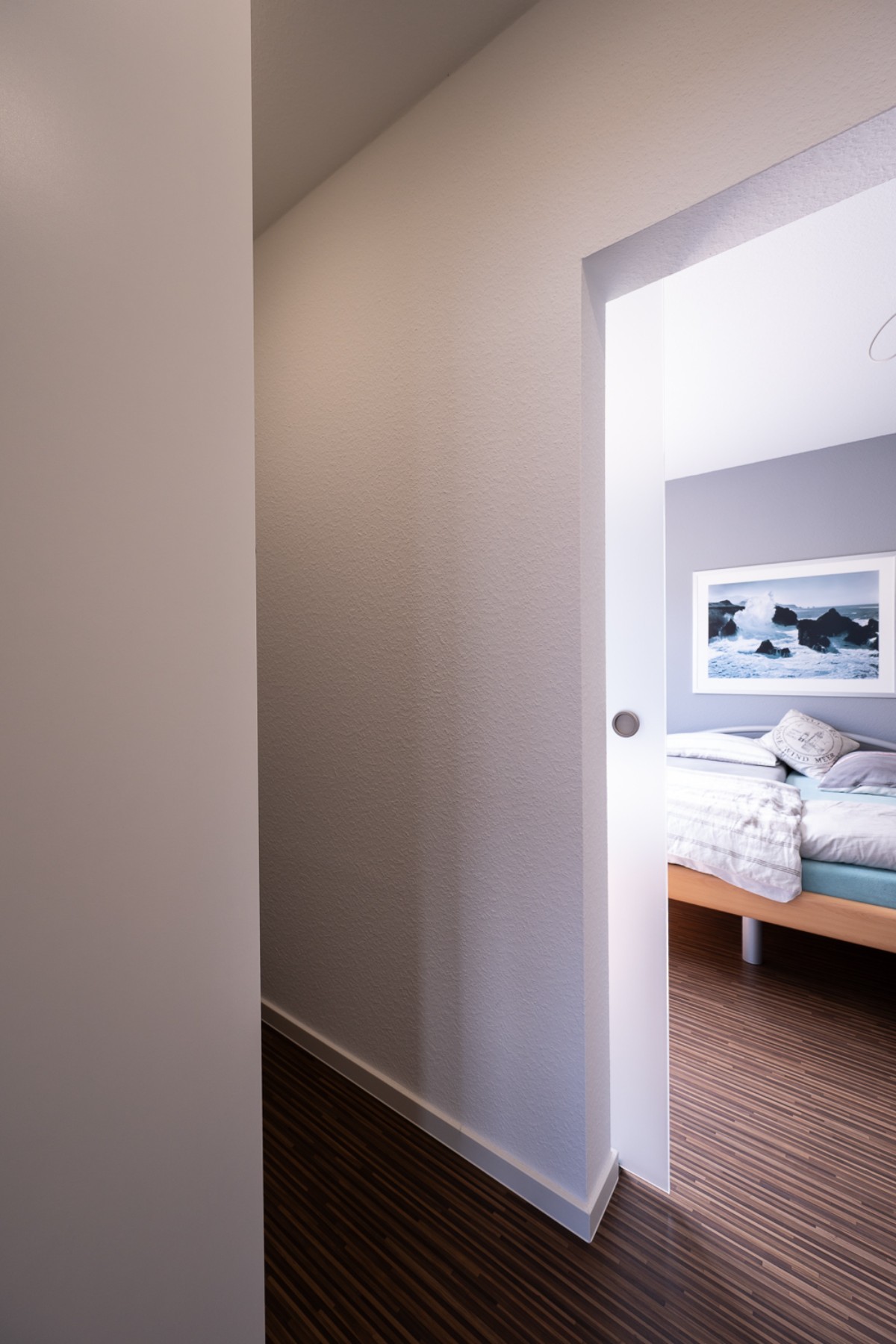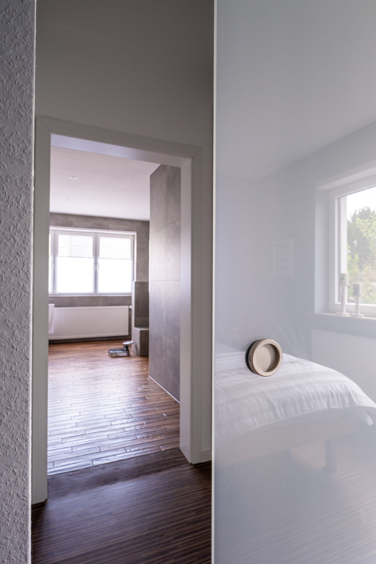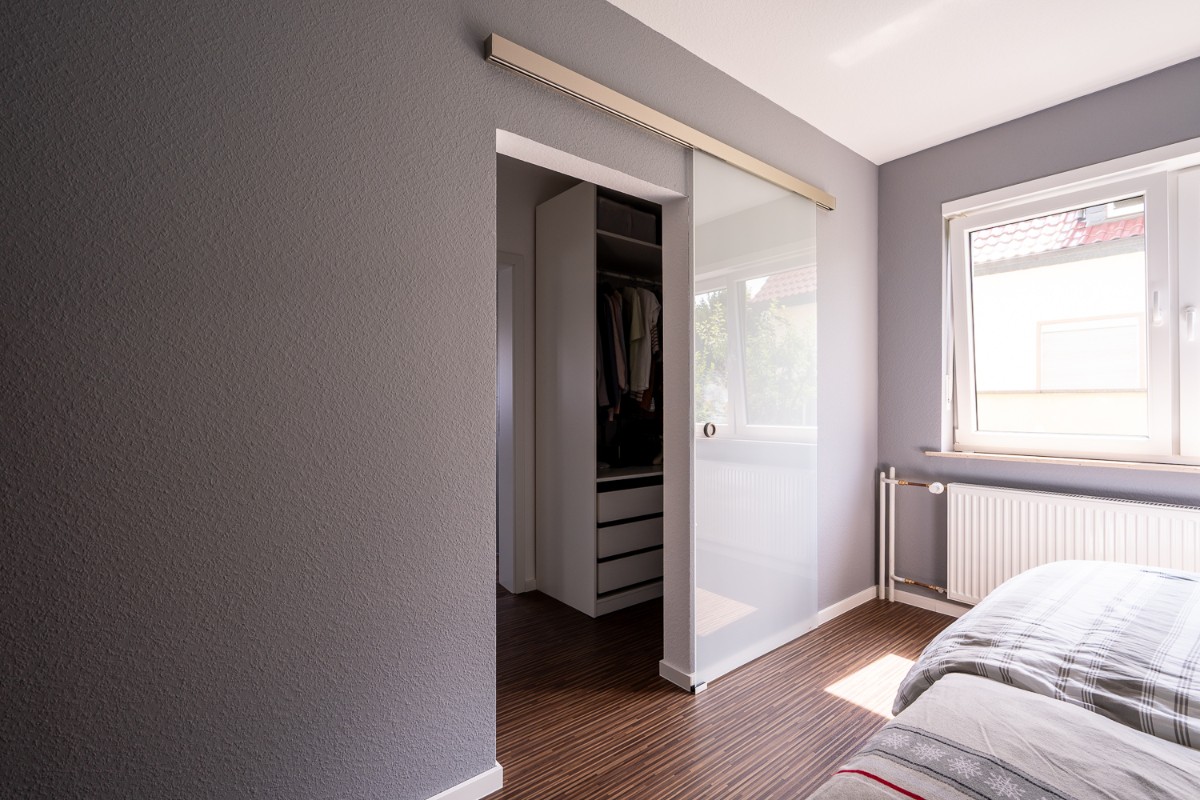 Die bestehende Küche zog mit um, wurde vom Schreiner perfekt an die neuen Gegebenheiten angepasst und mit einer neuen Arbeitsplatte ausgestattet. Vom Schlafzimmer führt nun ein direkter Weg durch die Ankleide in das neu gestaltete, barrierefreie Badezimmer, das Komfort und Funktionalität vereint. So entstand ein modernes, offenes Wohnkonzept, das optimal auf die Wünsche der Kundin zugeschnitten ist.